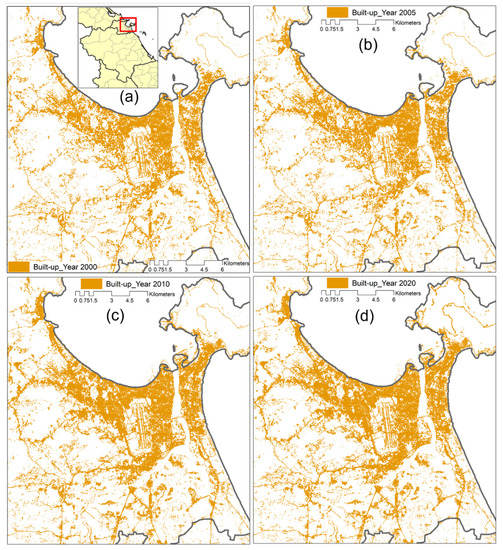 The built-up area distribution in (a) 2000, (b) 2005, (c) 2010, and (d) 2020 in Da Nang city.