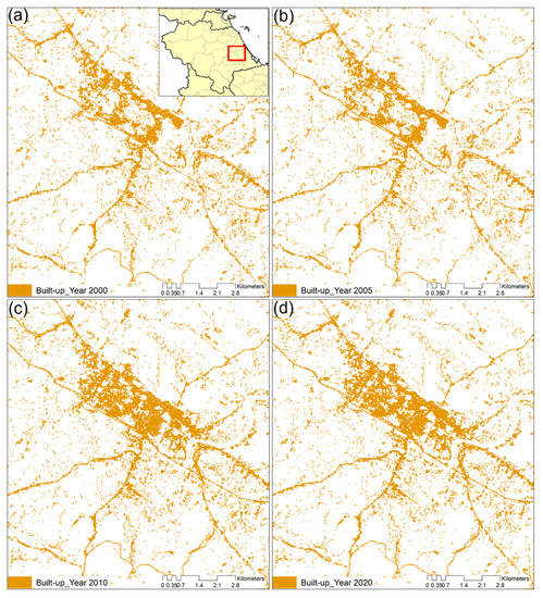 The distribution of built-up area in (a) 2000, (b) 2005, (c) 2010, and (d) 2020 in Quang Nam province.