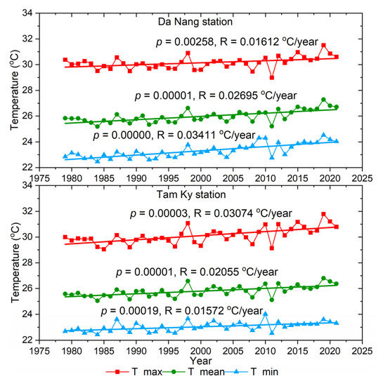 The maximum, minimum, and mean temperature in the Da Nang and Tam Ky meteorological stations from 1979 to 2021. p—statistically significant, R—Decreased/increased rates are the slopes of the linear regression.