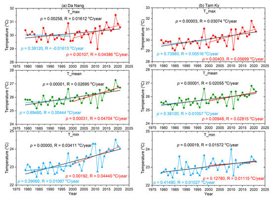 The maximum, mean, and minimum temperature trends in 1979–2021, 1979–1999, and 1999–2021 in (a) Da Nang meteorological station for Da Nang city; (b) Tam Ky meteorological station for Quang Nam province. p—statistically significant, R—Decreased/increased rates are the slopes of the linear regression.