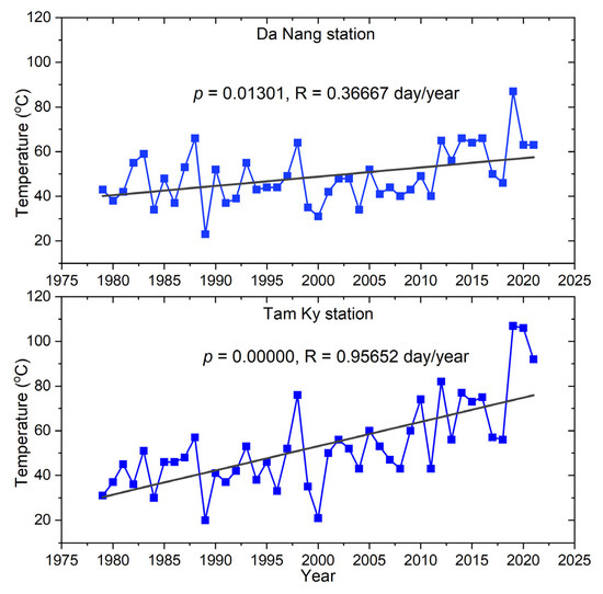 The number of high-temperature days (35 °C) at the Da Nang and Tam Ky meteorological stations. p—statistically significant, R—Decreased/increased rates are the slopes of the linear regression.