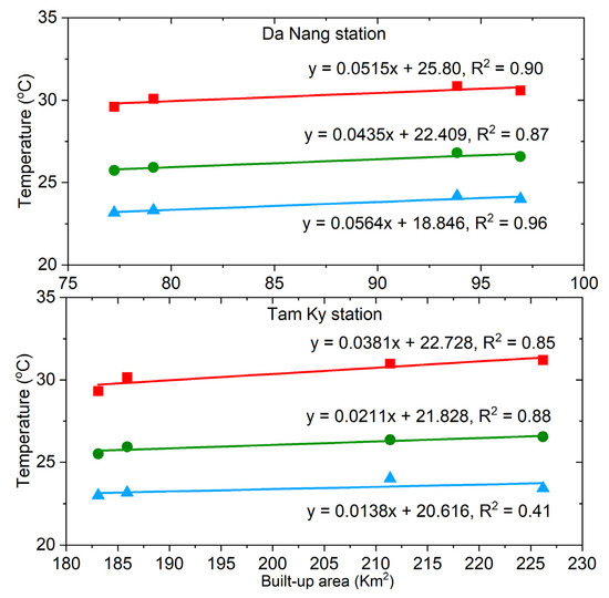 Figure 10 shows a strong correlation between the UHI and built-up area in the Da Nang city. For mean temperature, a higher built-up area (km2) shows a higher temperature record (°C), indicating a strong relationship and positive correlation between them, followed by minimum and maximum temperatures. It then confirmed the previous main key findings regarding the effects of increasing urbanization to UHI [7,25,29,30,32,78]. However, our results indicated a lower correlation between UHI and the built-up area for the maximum, minimum, and mean temperatures in Quang Nam province with the built-up area of around 215 km2 shows a lower minimum temperature.
