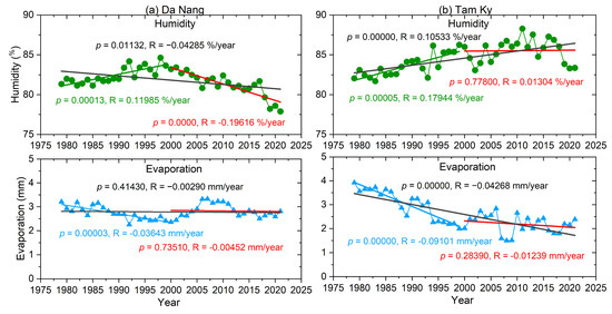 Humidity and evaporation trends in 1979–2021, 1979–1999, and 1999–2021 in (a) Da Nang meteorological station for Da Nang city; (b) Tam Ky meteorological station for Quang Nam province. p—statistically significant, R—Decreased/increased rates are the slopes of the linear regression.