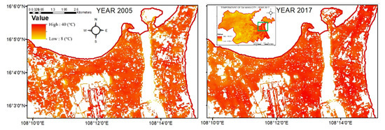 Figure 12 shows the regional temperature distribution across the highly populated area between 2005 and 2017. It indicated that the temperature in Da Nang city varies from 31.80 °C to 32.82 °C over the 12-year chosen period. The high temperatures were predominantly concentrated in urbanized regions with less coverage of trees, plants, and water bodies, consistent with key findings from [18] for the land surface temperature patterns in 2003, 2007, and 2015 (Hanoi inner city) or [25]’s key findings on the increased UHI from 10.98% (1999) to 31% (2016) for the same study area. It again confirmed the consistency of the increase of UHI reported by [10] and highlighted by the [2,3,4] with the rapid acceleration of industrialization and modernization Vietnamese cities and the key findings of [7] regarding the change of green or water cover into urban land cover (built-up) contributing the most to the temperature increase.