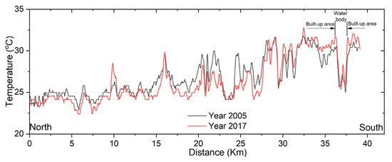 Figure 13 depicts the regional distribution of temperature from the northern to the southern side of the study region. The overall trend of temperature change over the studied periods shows consistency with more fluctuations over the chosen years (Figure 12). However, temperature fluctuates substantially across years, particularly in urban areas, rivers, and forests, with temperature differences between urban and forest areas in 2005 and 2017 being 4.84 °C and 6.37 °C, respectively (Figure 13). Furthermore, the surface temperature in 2005 was lower compared to 2017, with higher temperature records observed closer to densely inhabited areas (Figure 12 and Figure 13). Moreover, the average temperature in 2005 was around 26.83 °C whereas the temperature difference between urban and forest regions was 7.15 °C. This difference in temperature has increased significantly in regions with high water coverage (Figure 13) between 2005 and 2017. Additionally, the surface temperatures in 2005 and 2017 were comparable to the mean temperature, which were at 26.83 °C and 26.45 °C, respectively. The temperature was higher in urban areas as well as between different regions, which could indicate the increase of the built-up area.