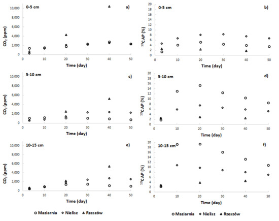 Changes in CO2 concentrations – panels (a,c,e) and values of 13C AP – panels (b,d,f) over the time of incubation of sediments.
