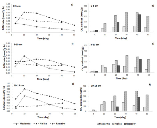 The amounts of CH4 oxidised during the incubation are as shown in Figure 3b,d,f. In Nielisz Reservoir (where AOM was most intensive), the maximum amount of CH4 oxidised characterised day 30 in the 0–5 cm and 5–10 cm layers, or day 40 in the 10–15 cm layer. In Maziarnia Reservoir, a maximum on day 40 was only recorded for the surface sediment layer, with deeper layers reporting their maximum as early as on day 20. In Rzeszów Reservoir, the amount of CH4 oxidised continued to increase through to day 40 in all sediment layers, it not therefore being known if maxima had been reached or if further increases might have been noted.