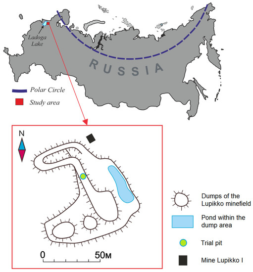 Location of the study area and the scheme of the dump disposal near the mine Lupikko I.