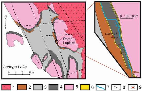 Geological scheme of the Pitkäranta area, according to [25,33], with simplifications and additions. Legend: 1—granite rocks of the Salmi batholith; 2—Svecofennian acidic rocks and «ceramic» pegmatites; 3—Al-enriched schists of the Ladoga group; 4—amphibolites and amphibole schists with carbonate horizons (Sortavala group); 5—gneiss-granites of domes; 6—carbonate horizons (Sortavala group); 7—Ristioja River and direction of its flow; 8—main faults; 9—location of the mine Lupikko I.