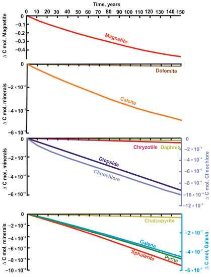 The simulation results are summarized and presented in Figure 4, Figure 5 and Figure 6. Since dump rocks predominantly comprise poorly soluble minerals, their composition has changed slightly (Figure 4). Magnetite is the predominant mineral in the rock dump (40%), so its dissolution on the graphs seems significant compared to other minerals. Its amount reduces by 0.47 mol per kg of initial dump rock. The change in the amount of calcite is only 0.048 mol, dolomite—0.0012 mol. The dissolution of silicate minerals (diopside, chrysotile, clinochlore, and daphnite) is also insignificant. It is confirmed by small changes in their molar volumes (Figure 4). Sulfide minerals are also poorly soluble under modeling conditions. The amount of dissolved pyrite is 0.0008, sphalerite—0.0009, chalcopyrite—0.00006, and galena—4.58 × 10−7 mol for the entire period of water–rock interaction, which was established in modeling.