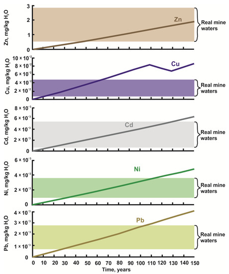 The content of heavy metals rises with the increasing time of water–rock interaction. Zinc has the highest concentration among the heavy metals (1.91 mg/kg H2O at the last modeling step). The concentration of other metals is much lower by the end of the modeling: nickel—0.0048 mg/kg H2O, copper—0.085 mg/kg H2O, cadmium—0.0063 mg/kg H2O, lead—0.0041 mg/kg H2O.