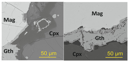 Back-scattered electron images of goethite rims between magnetite and clinopyroxene. Legend: Mag—magnetite, Cpx—clinopyroxene, Gth—goethite.