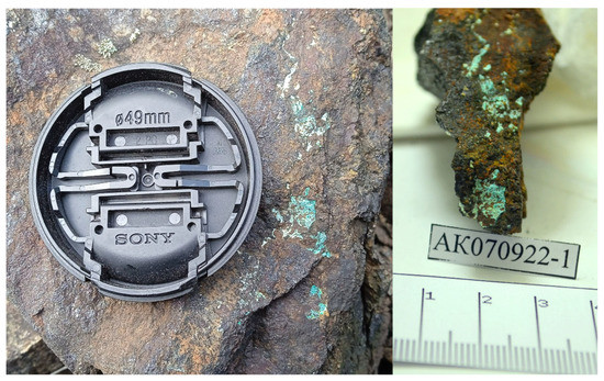 Sulfides are the source of all considered heavy metals. Nickel, Zn, Cd, and Pb accumulate in the solution during the water–rock interaction. By the end of the modeling, the Zn concentration (1.91 mg/L) falls in the interval highlighted in Figure 6, which indicates the Zn content in the mine waters. The calculated concentration of Cd is slightly higher than the concentrations in the studied mine waters. For Ni and Pb, this difference is more pronounced: their content at the last modeling step is higher than that found in the mine water. The model concentration of Cu is also higher than that observed in the studied mine waters. The formation of malachite slows the accumulation of Cu in the solution after 110 years of water–rock interaction (Figure 5). Visual observation of the dump rocks revealed greenish mineral films, probably represented by copper hydrocarbonates (malachite or azurite) (Figure 8).