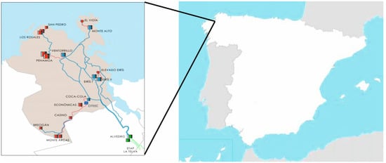 The water distribution network consists of pipes with different characteristics: fiber cement, grey cast iron, and ductile cast iron with cement mortar or PVC coating. From A Telva, the pipe system distributes water to different points in the city of La Coruña and its neighboring municipalities (Figure 1).