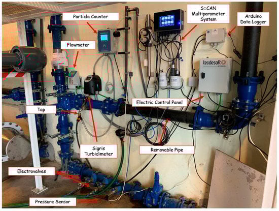 For this study, a bypass was built in the water supply distribution network of the city of La Coruña (Spain) that connects the network with a monitoring panel (Figure 2) at the CITEEC point, as shown in Figure 1. The list of instruments installed is as follows:
