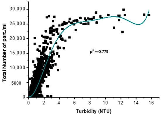 Figure 3 shows the correlation between the total number of particles/mL produced during the year of monitoring regarding turbidity.