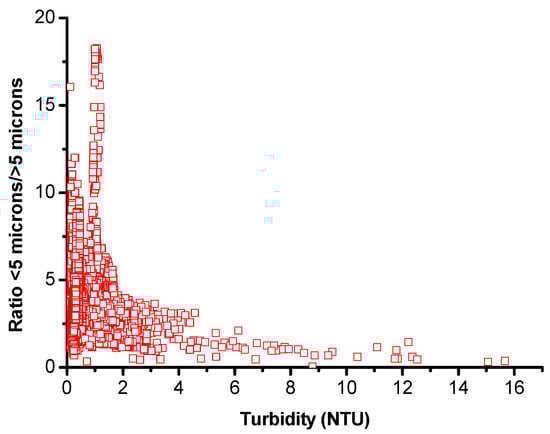 Figure 4 shows the ratio of the number of particles/mL less than 5 microns to that of particles greater than 5 microns, with respect to turbidity. A descending graph can be observed, which indicates that the lower the ratio, the higher the turbidity, which is reasonable: turbidity will increase with a higher relative number of larger particles.