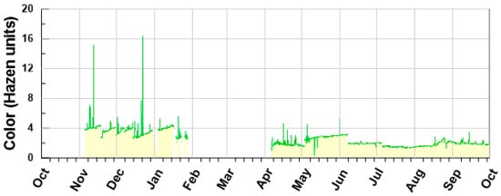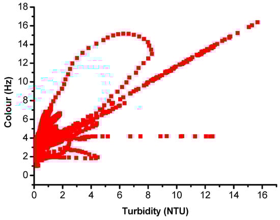 Figure 5 presents the relationship between color and the measured turbidity. There is no good correlation, since high turbidity is not synonymous with greater discoloration. Thus, to corroborate this finding, tap water samples were taken at various times when there were turbidity episodes and under normal conditions; the results verified that the color (or color perception) depends on the composition of the water.