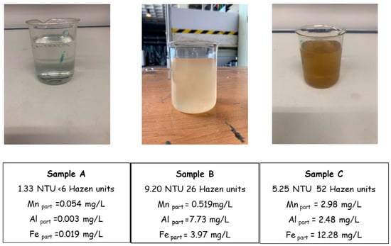 Figure 6 shows photographs of three samples and the corresponding measurements of color (measured in Hazen units), turbidity, and concentrations of particulate iron, particulate manganese (oxides), and particulate aluminum (hydroxide). The sample with greater turbidity (9.2 NTU) has a light color (26 Hazen units) due to the higher concentration of particulate aluminum (7.73 mg/L) compared to particulate iron (3.97 mg/L) and particulate manganese (0.519 mg/L), whose oxides and hydroxides have a gelled appearance.