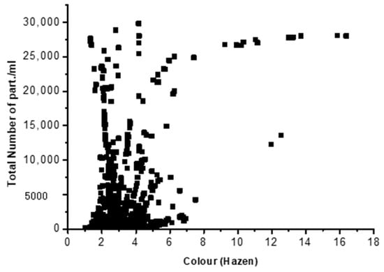 The following supporting information can be downloaded at: https://www.mdpi.com/article/10.3390/w14213383/s1, Figure S1. Graph of the number of particles/ml from 2 to 5 microns with respect to turbidity. Figure S2. Graph of the number of particles/ml from 5 to 10 microns with respect to turbidity. Figure S3. Graph of the number of particles/ml from 10 to 15 microns with respect to turbidity. Figure S4. Graph of the number of particles/ml from 15 to 25 microns with respect to turbidity. Figure S5. Graph of the number of particles/ml from 25 to 50 microns with respect to turbidity. Figure S6. Graph of colour with respect to the dissolved Fe concentration. Figure S7. Graph of colour with respect to the dissolved Mn concentration. Figure S8. Representation of the colour with respect to the dissolved Al concentration. Figure S9. Graph of the number of particles/ml from 2 to 5 microns with respect to colour. Figure S10. Graph of the number of particles/ml from 5 to 10 microns with respect to colour. Figure S11. Graph of the number of particles/ml from 10 to 15 microns with respect to colour. Figure S12. Graph of the number of particles/ml from 15 to 25 microns with respect to colour. Figure S13. Graph of the number of particles/ml from 25 to 50 microns with respect to colour. Figure S14. Graph of the ratio of the number of particles/ml less than 5 microns to the number of particles/ml greater than 5 microns with respect to colour. Figure S15. Time evolution of the number of particles/ml from 2 to 5 microns. 2020/2021. Figure S16. Time evolution of the number of particles/ml from 5 to 10 microns. 2020/2021. Figure S17. Time evolution of the number of particles/ml from 10 to 15 microns. 2020/2021. Figure S18. Time evolution of the number of particles/ml from 15 to 25 microns. 2020/2021. Figure S19. Time evolution of the number of particles/ml from 25 to 50 microns. 2020/2021.