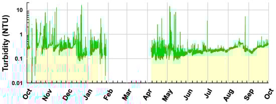 Notably, it was confirmed that water discoloration and turbidity do not have a direct relationship, but that color is more closely related to the composition of particulate material in the water (concentration of Fe, Mn, or Al). Currently, a broader analysis is not presented because a large sample population is not available for sample collection during turbidity episodes. Currently, there is no instrumentation available for the continuous measurement of particulate cation concentrations, which means that sample collection during turbidity and/or discoloration episodes depends on the operational availability of the collection systems.