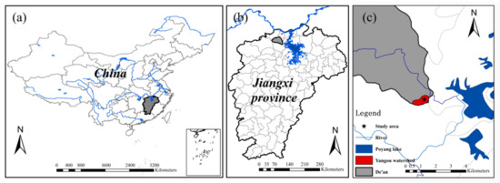 Location map of test area (a) Location of Jiangxi Province in China; (b) Location of De’an County in Jiangxi Province; (c) The location relationship between the test site and Yangou watershed, De’an County and Poyang Lake.