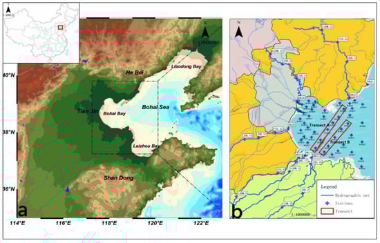 Location map of sampling stations of Bohai Bay and relevant rivers flowing into the bay in summer 2020. The inserted regional map indicates the location of the Bohai Bay in northeastern China. The red rectangles represent the transects we investigated. Scale on the upper left map is 1:600,000,000.