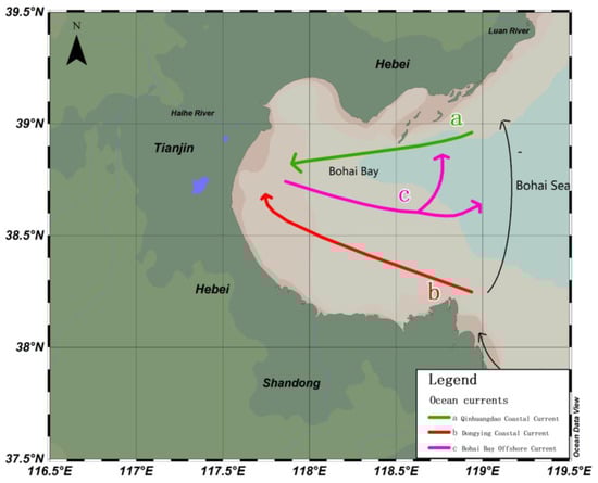 The primary productivity of marginal seas accounts for 18–33% of the total global primary productivity of marginal seas and plays an important role in the global carbon cycle [1]. The ocean is also a regulator of atmospheric carbon dioxide (CO2) that has an important role in balancing atmospheric CO2 concentrations and mitigating global warming caused by increasing CO2. Seawater carbonate species have an important influence on the acid–base balance in the ocean and play an important role in controlling seawater pH, influencing multiple chemical balances and marine biological activities. The increase in CO2 affects the carbonate equilibrium system of seawater and reduces calcium carbonate (CaCO3) formation, and predictions indicate that oceanic calcium deposition (calcification) will decrease by 14% to 30% by 2100 [2]. Coastal regions are particularly vulnerable to anthropogenic acidification, which is driven mainly by oceanic uptake of anthropogenic CO2 and enhanced eutrophication associated with complex mechanisms and human activities [3]. However, the carbonate species and pCO2 variability in coastal oceans remain highly uncertain because of the complexity of physical and biogeochemical processes, including tidal mixing and riverine input to coastal oceans [3,4,5]. Changes in the seawater carbonate species will alter the seawater chemical environment, affecting the health of marine ecosystems. Due to the complex hydrodynamic conditions and the limited coverage of observation sites in the nearshore sea, study of the carbonate species in the shelf-edge sea still faces many challenges [6]. The role of marginal seas in the marine biogeochemical cycle has increased. Marginal seas also play a vital role in the global carbon cycle. Therefore, the carbonate species has become an area of interest in global carbon cycle research. Bohai Bay, one of the three major bays of the Bohai Sea in northeastern China, is located in the western part of the Bohai Sea and is surrounded by Hebei Province, Tianjin City and Shandong Province. It spans from the mouth of the Luanhe River to the mouth of the Yellow River at its eastern boundary. Bohai Bay receives a vast amount of fresh water from the Haihe River, Luanhe River and Yellow River Basins [7]. It is a semi-enclosed bay surrounded by land on three sides with a slow seawater exchange rate and clockwise circulation. As Bohai Bay is a semi-enclosed bay, the poor water exchange capacity of Bohai Bay makes it difficult to export pollutants to adjacent offshore waters [8,9]. The bay receives about 1 billion m3 of sewage from the surrounding areas every year [10]. During the recent three decades, Bohai Bay suffered a reduction in size due to rapid industrialization and urbanization [11]. Clusters of cities with large populations surround Bohai Bay. The two most representative megacities are Beijing and Tianjin, each of which has a population of over 10 million [12]. As China’s economy grows rapidly, the pollution problems are becoming more and more serious and the seawater pollution of Bohai Bay has received widespread attention. Bohai Bay is considered to be one of the most polluted water bodies in China [13,14]. In recent years, the sea area of Bohai Bay has been reduced by about 15% due to many human activities, such as land-based pollution discharge, land reclamation and river interception [15], while the input of large amounts of nutrients such as nitrogen and phosphorus has led to an imbalance in the nutrient structure, offshore eutrophication and frequent red tide disasters. The flow speed and direction of the tidal current determine the water dispersion process and the sediment deposition process, which will also affect the ecological environment and the morphological changes of the bottom bed of the sea [16].
