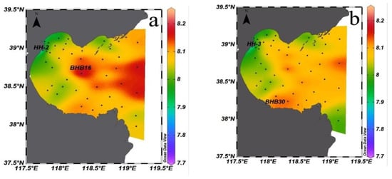The pH range in the surface and bottom seawater of Bohai Bay in summer 2020 was 7.73–8.22 and 7.79–8.16, respectively, with mean values of 8.05 and 8.05. The pH of the surface seawater (Figure 3a) in summer generally increased from nearshore to offshore, with the maximum value occurring at station BHB16 in the middle of the bay and the minimum value occurring at station HH-2 near the mouth of the Haihe river estuary. The pH in the bottom seawater (Figure 3b) of Bohai Bay in summer was generally lower in the western part of the bay and higher in the southern part of the bay near the shore, with the maximum value occurring at station BHB30 near the mouth of the Majia River and the minimum value arising occurring at station HH-3. This was similar to the minimum value for the surface layer.