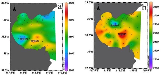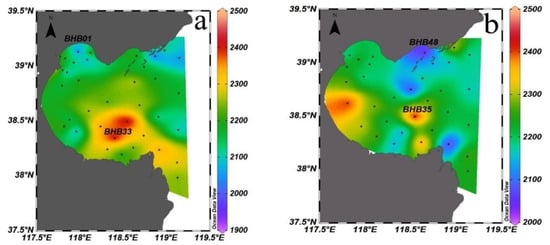 The Alk distributions in the surface seawater and the bottom seawater in Bohai Bay in summer 2020 were 2220–2941 µmol/kg and 2141–2810 µmol/kg, respectively, with mean values of 2338 µmol/kg and 2327 µmol/kg. In the surface layer (Figure 4a), Alk increased from the northwest to the southeast of the bay. The overall concentration was low in the north and high in the south, with a maximum value of 2941 µmol/kg at station BHB33 and a minimum value of 2220 µmol/kg at station BHB29. In the bottom layer (Figure 4b), Alk increased from the west to the east of the Bay. The overall concentration was low in the north and high in the south and high in the west and low in the east. The maximum value of 2810 µmol/kg occurred at station BHB35, close to the location at which the maximum value of surface Alk appeared. The minimum value of 2141 µmol/kg occurred at station BHB07 in the north of the bay.