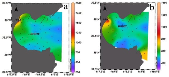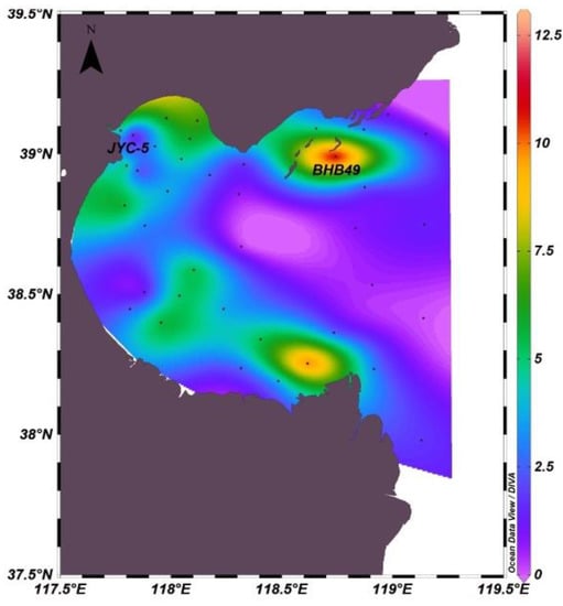 The mean values and ranges of DO, Chl-a and nutrients in the surface and bottom seawater of Bohai Bay are shown in Table 2. The mean values of DO and Chl-a in the surface layer of Bohai Bay were higher than those in the bottom layer, which were 7.31 mg/L and 9.31 µg/L, respectively. The mean value of was highest in both surface and bottom nutrients and the maximum was 18.50 µmol/L in the surface layer. The maximum values of DO and Chl-a occurred in the surface layer.