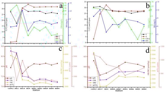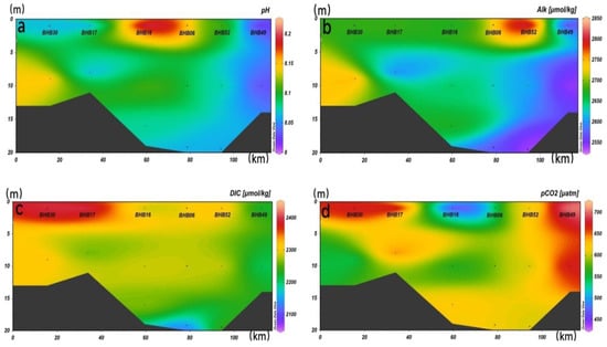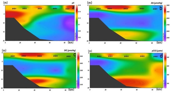Transect B was a transect of the MaJia River extending into Bohai Bay with six sampling sites, and the sampling stations were also aligned southwest to northeast with the river extension. The pH (Figure 9a), Alk (Figure 9b), DIC (Figure 9c) and pCO2 (Figure 9d) of seawater in this transect were 8.01–8.22, 2477–2771 µmol/kg, 2045–2366 µmol/kg and 433–714 µatm, respectively. The pH decreased from the surface layer to the bottom layer in the central sea of transect B. The pH distribution presented little variation in the nearshore area. In this transect, Alk gradually decreased with depth with a high value of 2771 µmol/kg in the surface layer of station BHB52. DIC also gradually decreased with increasing depth, and the vertical distribution in the middle layer was more uniform, but the distribution of the highest value differed slightly from that of Alk. The maximum DIC value was found in the surface layer of station BHB17. pCO2 gradually increased with depth in transect B. Its distribution trend was completely opposite to that of the pH, and the minimum value of 433 µatm appeared in the surface layer of station BHB16.