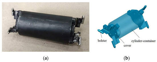 The physical model of a wheeled capsule and its schematic diagram are shown in Figure 1. The core of wheeled capsule pipeline transportation is the wheeled capsule. The wheeled capsule is the container of the loadings (raw material or others), and also the transportation device. The wheeled capsule consisted of a cylindrical container, covers, and bolsters. The cylindrical container was made of polymethyl methacrylate; the covers were deployed on the two sides of the container for waterproofing. The bolsters were forged by the cylindrical bars and link-planes. One group of three bolsters was deployed parallel to the cover plane, and the angle between any two bolsters was 120°. Each wheeled capsule had two groups of bolsters.