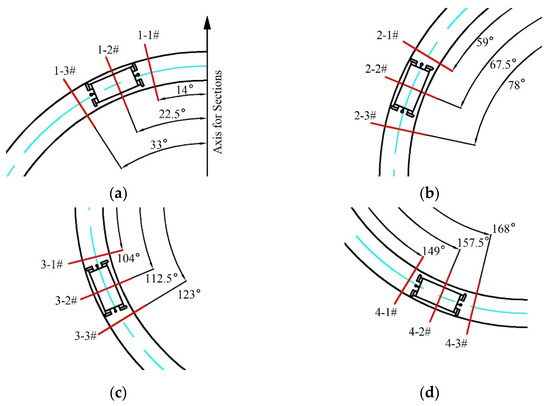 Analysis section layout: (a) location θ = 22.5° (first condition); (b) location θ = 67.5° (second condition); (c) location θ = 112.5° (third condition); (d) location θ = 157.5° (fourth condition). The symbols # are the marks of sections; the red lines are the locations of sections; the blue lines are the axis of the pipeline.