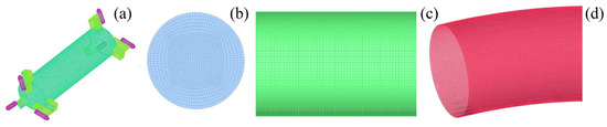 Grid diagram of each part: (a) mesh of the wheeled capsule; (b) mesh of the interface between the straight and the bend pipes; (c) structured mesh of the straight pipe; (d) unstructured mesh of the bend pipe.