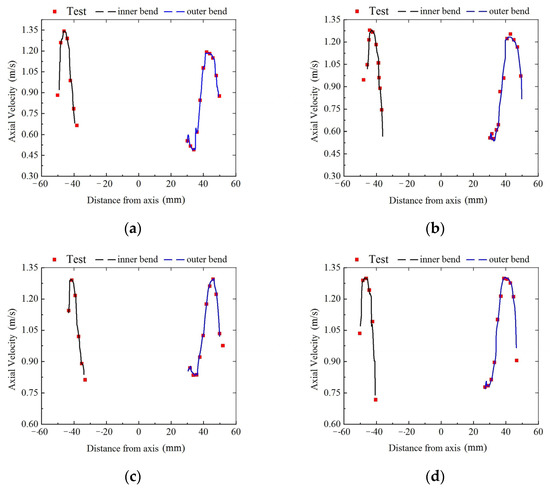 Comparison of simulation results and test results of the axial velocity of gap flow: (a) first condition θ = 22.5°; (b) second condition θ = 67.5°; (c) third condition θ = 112.5°; (d) fourth condition θ = 157.5°.