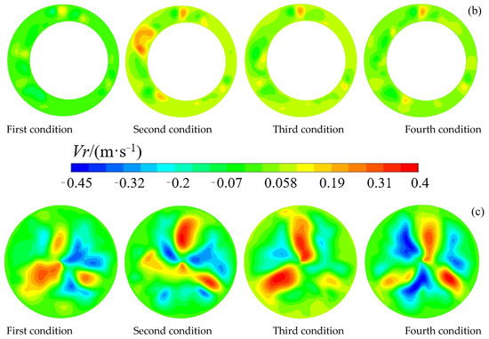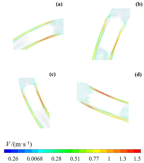As shown in Figure 7a–d, the four conditions are the positions of capsules and the total flow distributions of the pipelines were changed severely by the wheeled capsule. The changes had two influences. The first was that the velocity gradient of the gap flow between the capsule and pipe was larger than it of the pipe flow. The second was that the flow formed two backwash zones downstream of the capsule. Additionally, the two backwash zones were not symmetrical regarding the axes of the capsule, and the backwash zone was larger in the outer bend zone than in the inner bend zone, also leading to the radial velocity flowing from the outer bend to the inner bend zone.