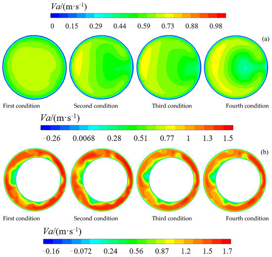 The axial velocity distributions of different conditions are shown in Figure 8. Upstream of the wheeled capsule, the axial velocities all followed the distribution of higher velocity in the outer bend zone and lower velocity in the inner bend zone, except the first condition (nearly symmetrical regarding the axis of the pipe). Additionally, the axial velocity got larger in the outer bend zone in all the conditions, because the flow traveled further in the bent pipeline. The effect of this limitation of the bent pipeline was critical. However, for the first condition, the flow passed only a little further in the bent pipeline, so the influence of the bent pipeline was not obvious. In the gap zone between the capsule and the pipe, the axial velocity was minor near the capsule but larger near the pipe. Additionally, the axial velocity in the outer bend zone was different from that in the inner bend zone. The flow section was small in the inner bend zone, but the velocity’s magnitude was larger, whereas the flow section was larger in the outer bend zone, but the velocity’s magnitude was smaller. There was a difference between the velocity’s magnitude in these two flow sections; the difference became larger from the first condition to the fourth condition. Downstream of the wheeled capsule, the axial velocity was minor near the axis, even negative, and the velocity was larger near the pipe. This was because of the existence of backwash zones. The backwash zones transport the flow from the pipe wall to the axis of the pipe. Additionally, there was no obvious difference between the conditions. This meant that the blockage effect of the capsule weakened the asymmetry of the bent pipeline.