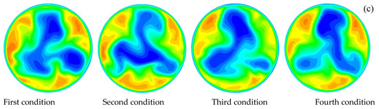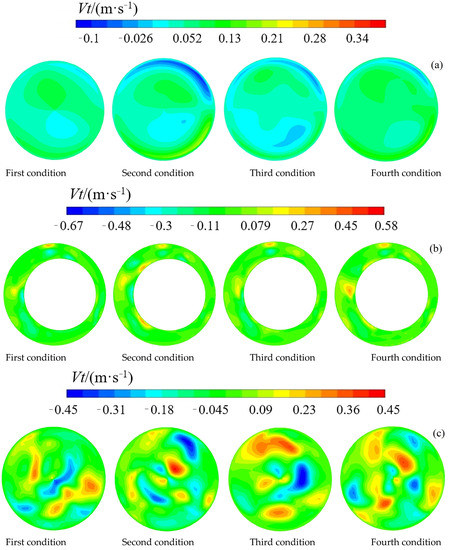 The circular velocity distribution of the four conditions in Figure 10 can provide some information about the transmission style of the sections. Upstream of the capsule, the circular velocity was negative near the pipe wall in the upper parts of the sections, and the circular flow direction pointed upstream via a right-handed helix. The circular velocity was positive near the pipe wall in the lower parts of the sections. This meant the flow direction pointed downstream via a right-handed helix. Additionally, in the middle parts of the sections, both the upper-half and the lower-half flow direction are pointed upstream via a right-handed helix. For the gap zone, the sections had narrow circular flow, and the velocity was lower (close to zero) than in other locations. The flow of the gap zone was stable and less circular. Downstream of the capsule, because of the effect of the flow in the bend, the circular velocity was larger than in other locations. The circular velocity distribution in the third condition was the most uneven, followed by the fourth condition and the second condition. The first condition had the most even distribution. The distribution of circular velocity was caused by the centrifugal transmission of the pipe flow. The flow had a tendency to travel from the inner bend to the outer bend. The outer-bend flow was pressed by the inner-bend flow.