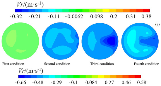 In the radial velocity distributions of the four conditions in Figure 9, the radial transmission of the flow is demonstrated. In summary, the radial velocity was larger upstream of the capsule than downstream. With the capsule in the same location, the radial velocity was larger in the whole bent pipe, both upstream and downstream. Upstream of the capsule, the velocity magnitude was larger in the outer bend zone than in the inner bend zone. In the gap zone between the capsule and the pipe, the radial velocity of the inner bend zone was larger than that of the outer bend zone. However, downstream of the capsule, the radial velocity showed no difference between the inner bend zone and the outer bend zone. The blockage effect of the capsule made the radial flow more even downstream of the capsule.
