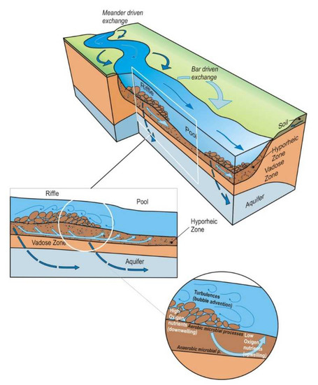 - Boulton, A.J.; Findlay, S.; Marmonier, P.; Stanley, E.H.; Valett, H.M. The functional significance of the hyporheic zone in streams and rivers. Annu. Rev. Ecol.Syst. 1998, 29, 59–81. [Google Scholar] [CrossRef]