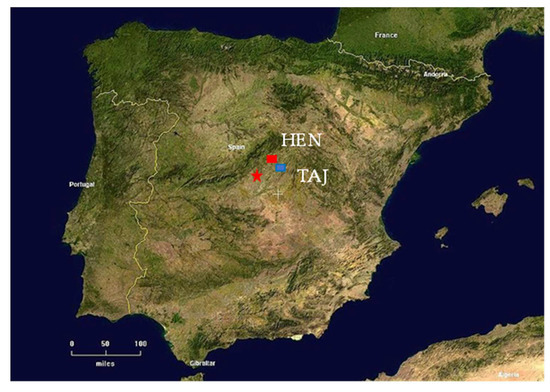 Location of the study sites in Madrid region (central Spain), HEN—Herras de Ayuso (Henares River) and TAJ—Romanones (Tajuna River).