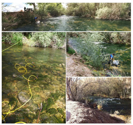 Pictures showing the main features of the investigated sites; (a–c) Heras de Ayuso (Site 1, HEN, Henares River), (d) Romanones (Site 2, TAJ, Tajuna River).