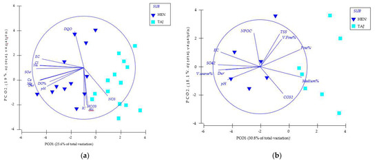 Principal coordinate analysis (PCO) plot of samples from the investigated sub-basin: Site 1 (a) (HEN—Heras de Ayuso, Henares River) and Site 2 (b) (TAJ—Romanones, Tajuna River) based on environmental parameters (abbreviations as in Table 1).