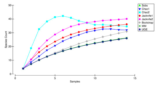 - Chao, A.; Lee, S.M. Estimating the number of classes via sample coverage. J. Am. Stat. Assoc. 1992, 87, 210–217. [Google Scholar] [CrossRef]