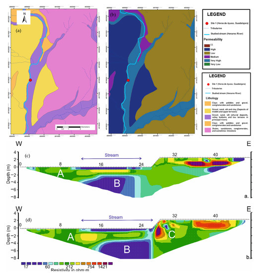Characteristics of the hyporheic zone at Heras de Ayuso (Site 1) Henares River. (a) lithology; (b) permeability; (c) ERT applied in June 2013; (d) ERT applied in April 2014.