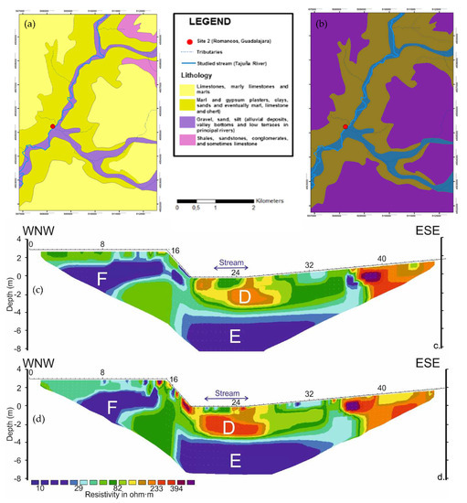 The overall resistivity variability due to the season ranges from 10–600 Ohm.m during the June 2013 (Figure 7c) to 3–1400 Ohm.m during the April 2014 (Figure 7d). Looking at the mean resistivity values obtained around the stream location, the resistivity is lower in April 2014 indicating a high content in water of the sediments at that time. Both profiles showed a low-permeability zone (D) from the benthic up to 0.5 m of the profile (thus including the hyporheic zone), with resistivity values ranging from 45 to 80 Ohm.m (Figure 7c,d).