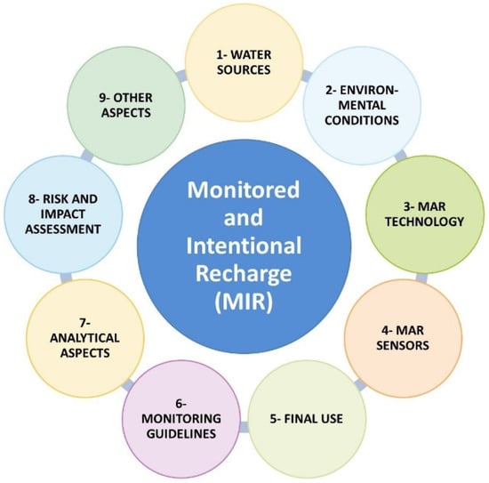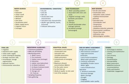 The MIR blocks are (1) water source, (2) hydrogeological and environmental conditions, (3) MAR technology, (4) MAR sensors for data gathering, (5) monitoring guidelines, (6) final use of the intentionally recharged water, (7) analytical aspects, and (8) risk or impact assessment (Figure 1 and Figure 2) []. An additional category was integrated, (9) others. It was infeasible to construct the blocks of the MIR conceptual model in parallel to the main aspects identified in MAR documents since the main aspects do not provide a sound logical framework to group regulatory and guiding key elements.
