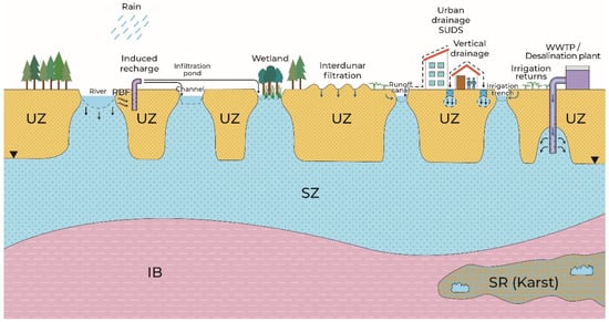 The first element in conducting MAR is the availability of water sources in sufficient quantity and adequate quality. The most common water sources in MAR projects include rivers, rainwater, urban runoff, reclaimed wastewater [,], wetlands (e.g., Phoenix, ISMAR 6), inter-dune filtration, desalination plants, urban supply surpluses, irrigation returns, and drainage (Figure 3).
