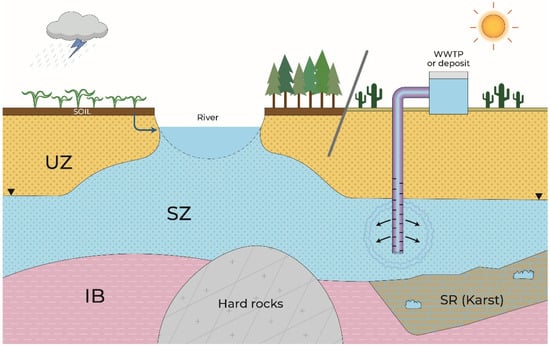 Another element to bear in mind is the interaction between the recharged water and the target geological formation. Different hydrochemical processes prevail in different regions during transit through the saturated and unsaturated zones, as is often observed with wastewater flowing through aquifers [,]. Furthermore, depending on the characteristics of the aquifer and due to redox conditions changes and residence times, the receiving medium has the potential to remove pollutants through processes such as sorption, solution, precipitation, cation exchange, and diffusion [,,,]. This purifying capacity is usually restricted to the so-called attenuation zone, which is recognized in some of the most modern regulations, including the Australian Guidelines for MAR [] and the Underground Injection Control Regulations and Safe Drinking Water Act Provisions from the USA [,], as a means of attaining groundwater quality objectives.